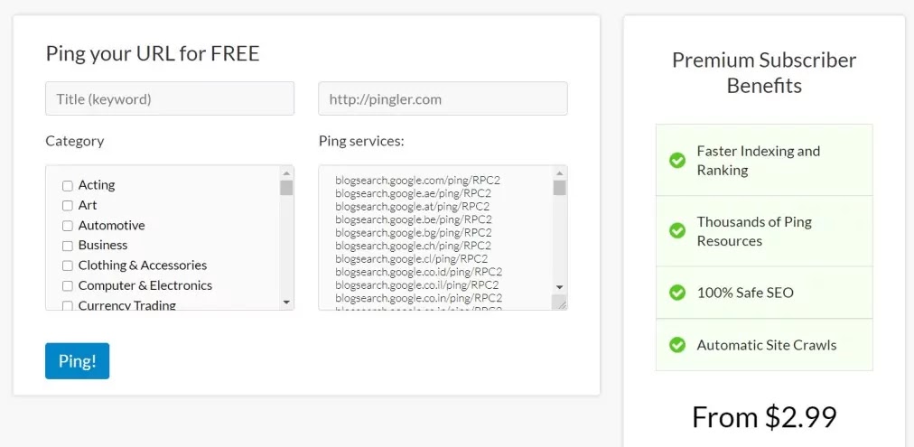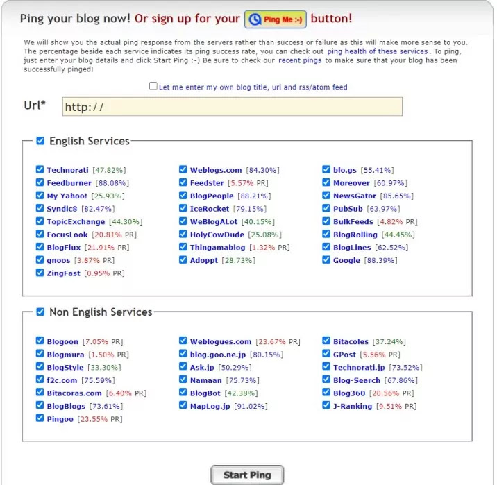 Mypagerank.net is one of the best sites for ping submission, it has a high collection of sources that can ping your website or blog.